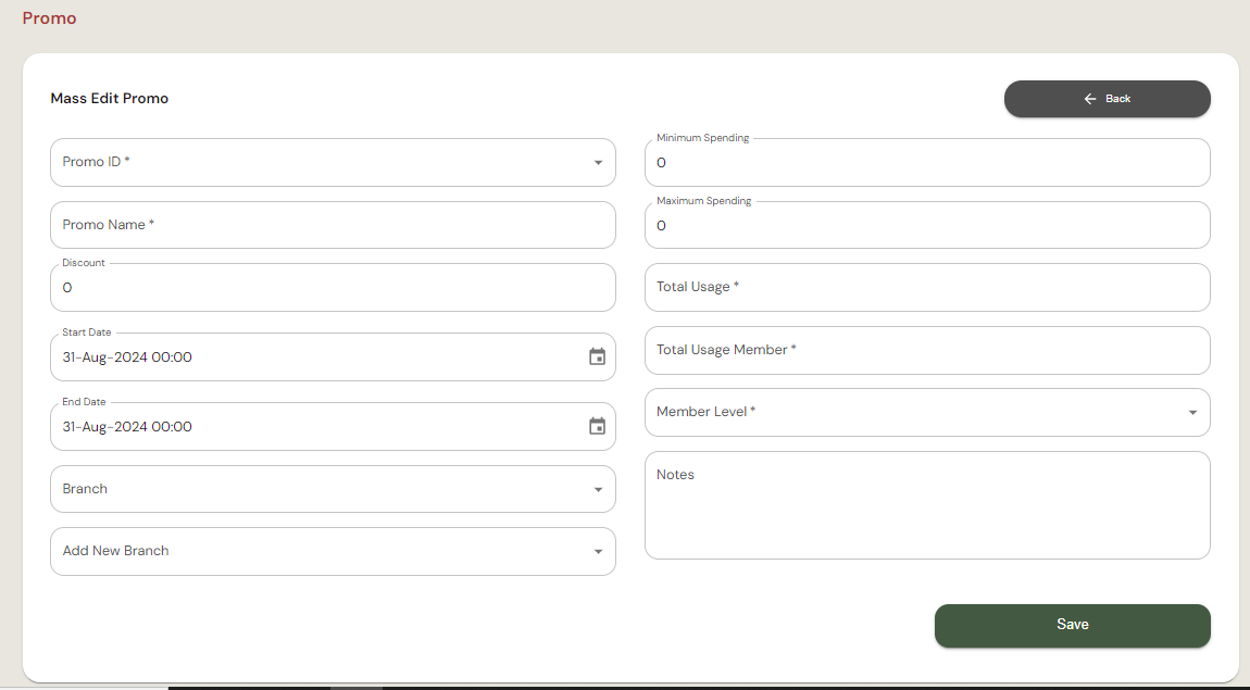 Jika ingin menambahkan branch baru yang memiliki product tersebut dapat menggunakan menu edit promo(Mass Edit) ini.