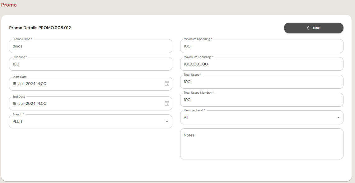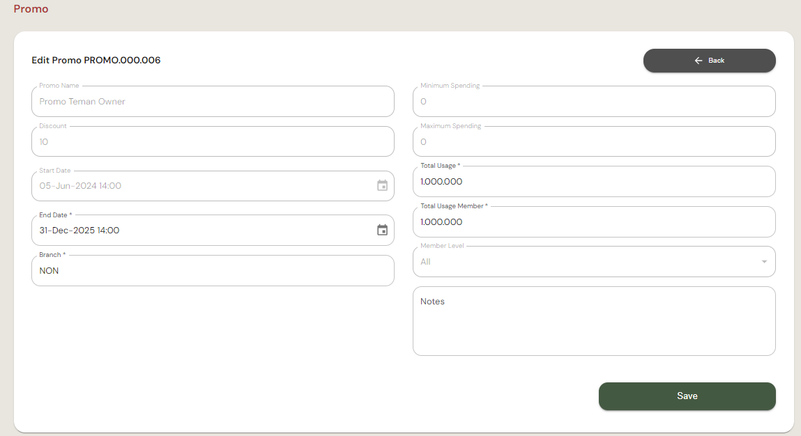 ** untuk case total usage member, jika terdapat promo X yang memiliki total usage member 1, member tersebut dapat menggunakan 1x di setiap branch, sehingga jika branch yang menerima promo X ada 3 branch. user tersebut dapat menggunakan promo X 3x di branch yang berbeda beda, masing masing 1x promo.