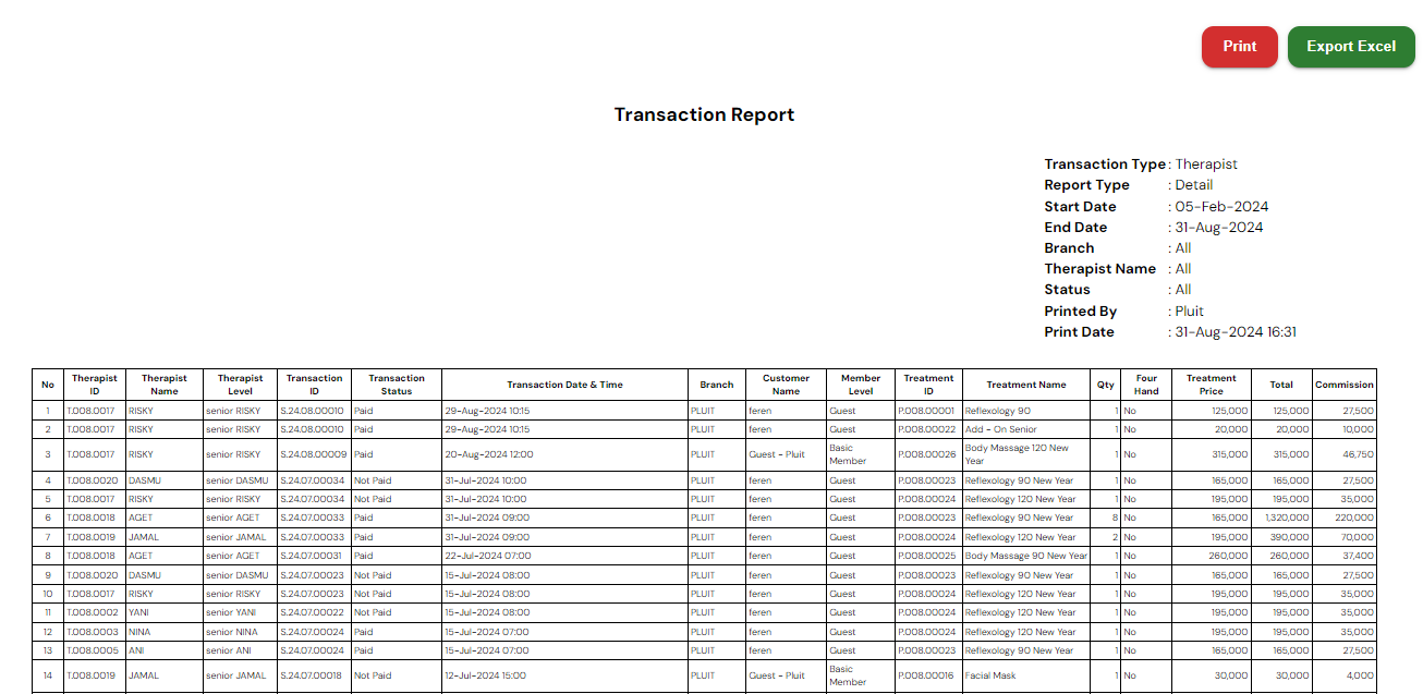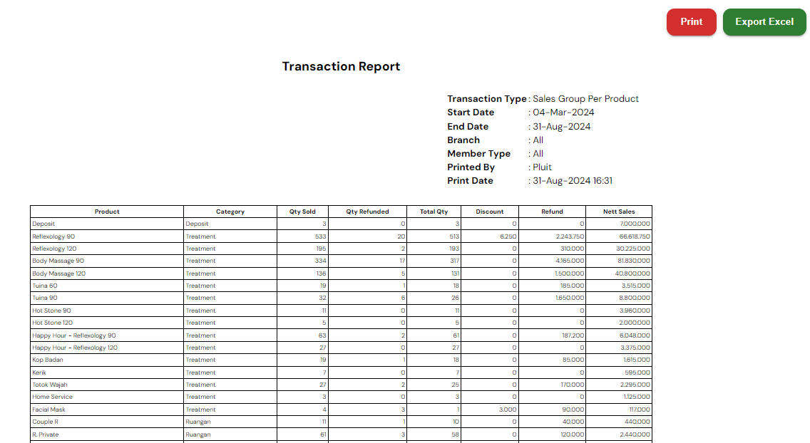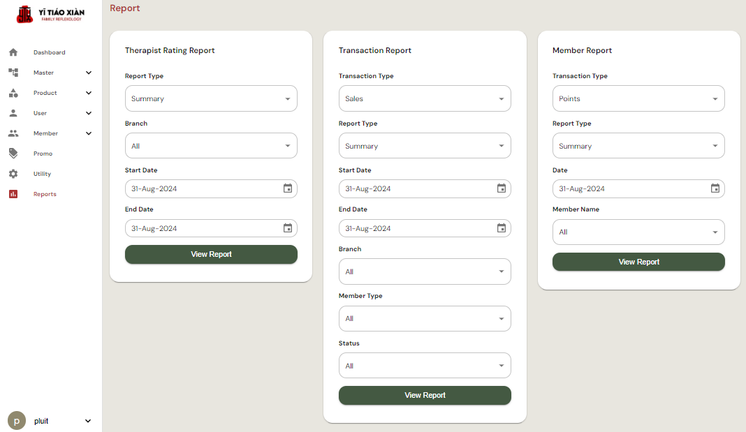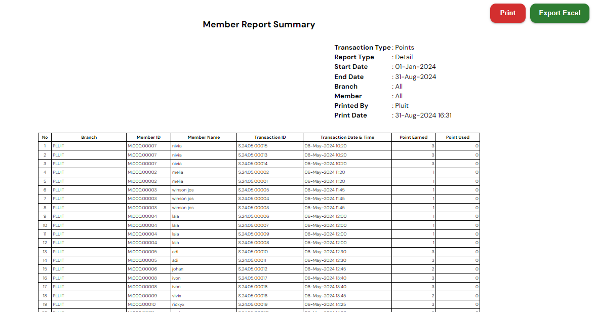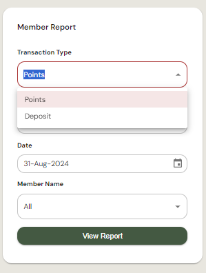 Menampilkan laporan terkait anggota berdasarkan jenis transaksi (misalnya, poin), jenis laporan, tanggal, dan nama anggota. Tekan "View Report" untuk melihat hasilnya.