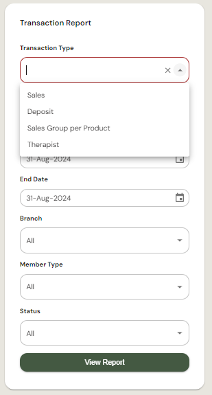 Menampilkan laporan transaksi (misalnya, penjualan) berdasarkan jenis transaksi, jenis laporan, rentang tanggal, cabang, tipe anggota, dan status. Tekan "View Report" untuk melihat hasilnya.
