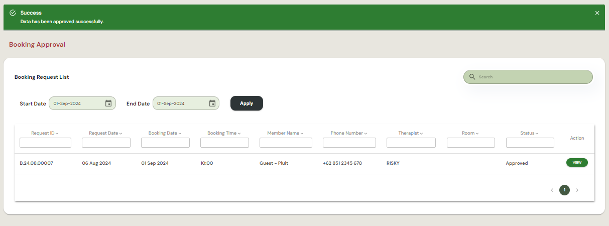 Filter Tanggal: Pilih Start Date dan End Date untuk menampilkan permintaan booking dalam rentang tanggal tertentu dan klik Apply.