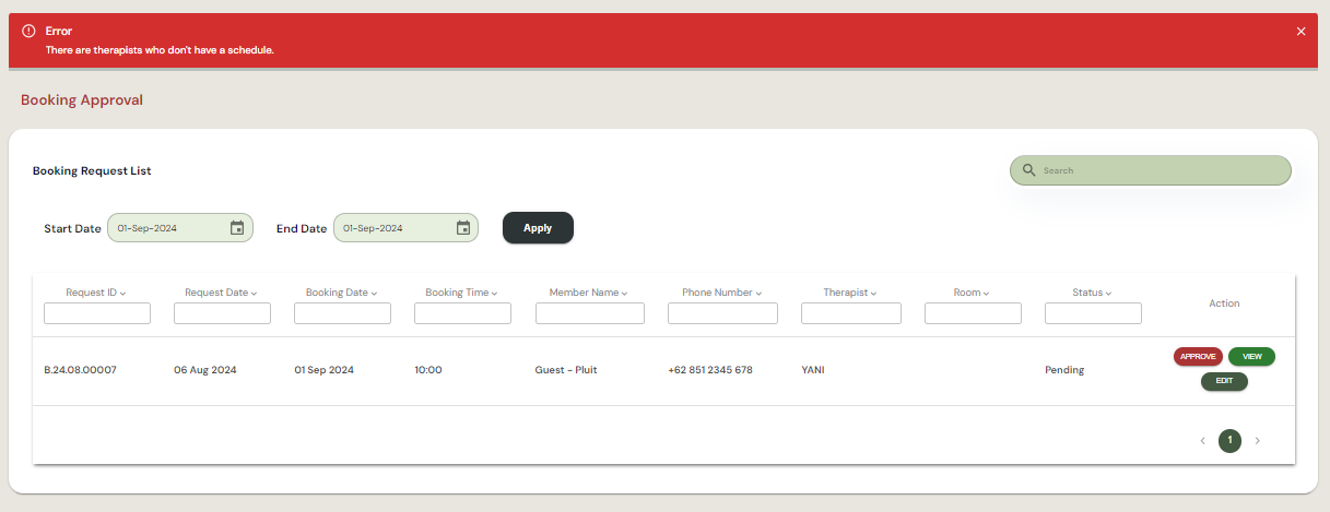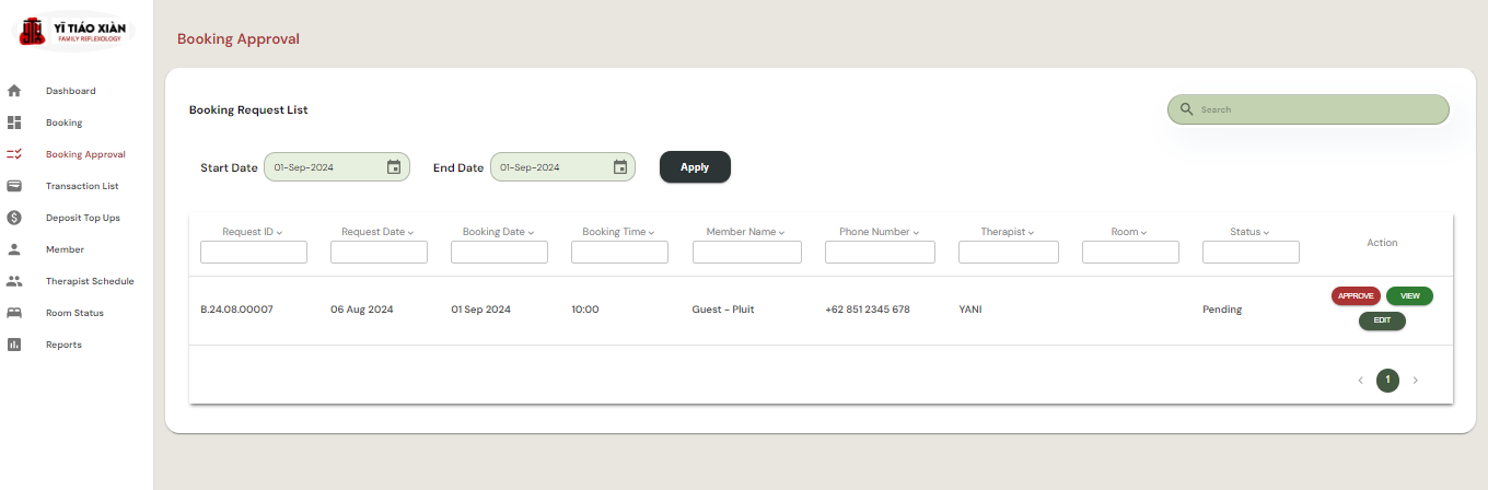 Daftar Permintaan Booking: Tabel menampilkan permintaan booking dengan informasi seperti Request ID, Request Date, Booking Date, Booking Time, Member Name, Phone Number, Therapist, Room, dan Status.