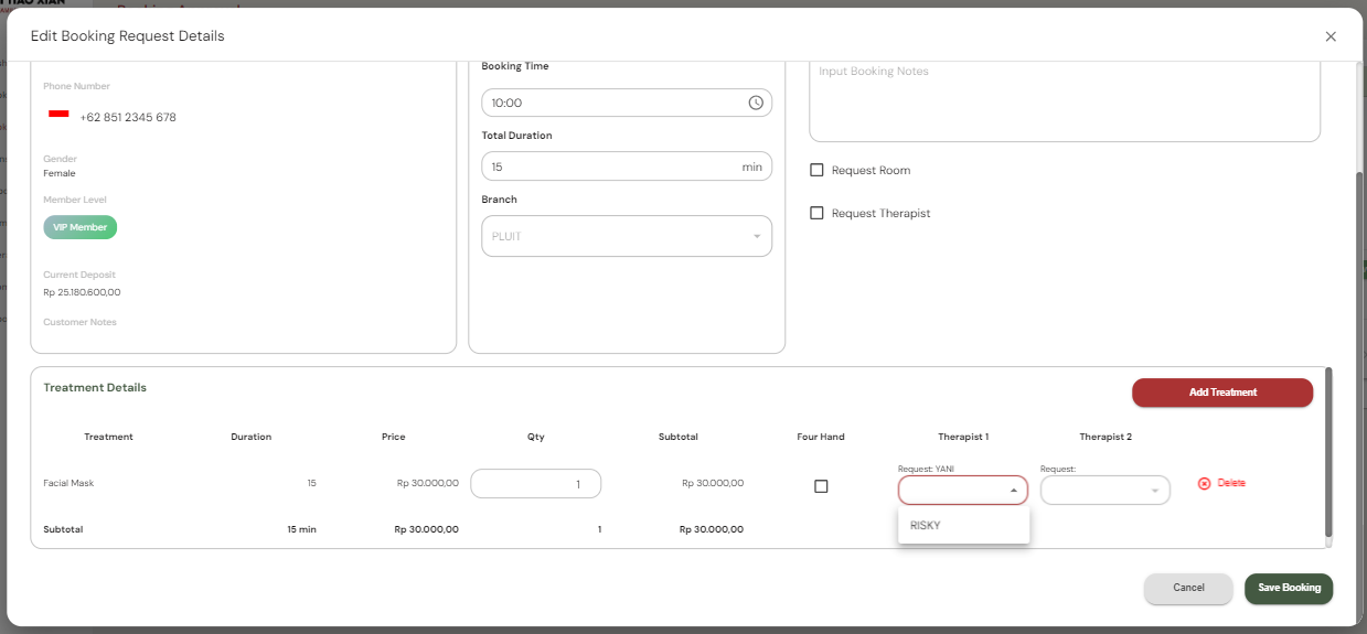 3. untuk case diatas dapat diselesaikan dengan mengganti therapist dengan therapist yang tersedia atau sedang ada jadwal dengan klik tombol Edit pada kolom action. Maka akan muncul form Edit Booking Request Details. Ubah kolom Therapist dengan therapist yang tersedia. Pada case ini yang tersedia hanyalah Therapist Risky.