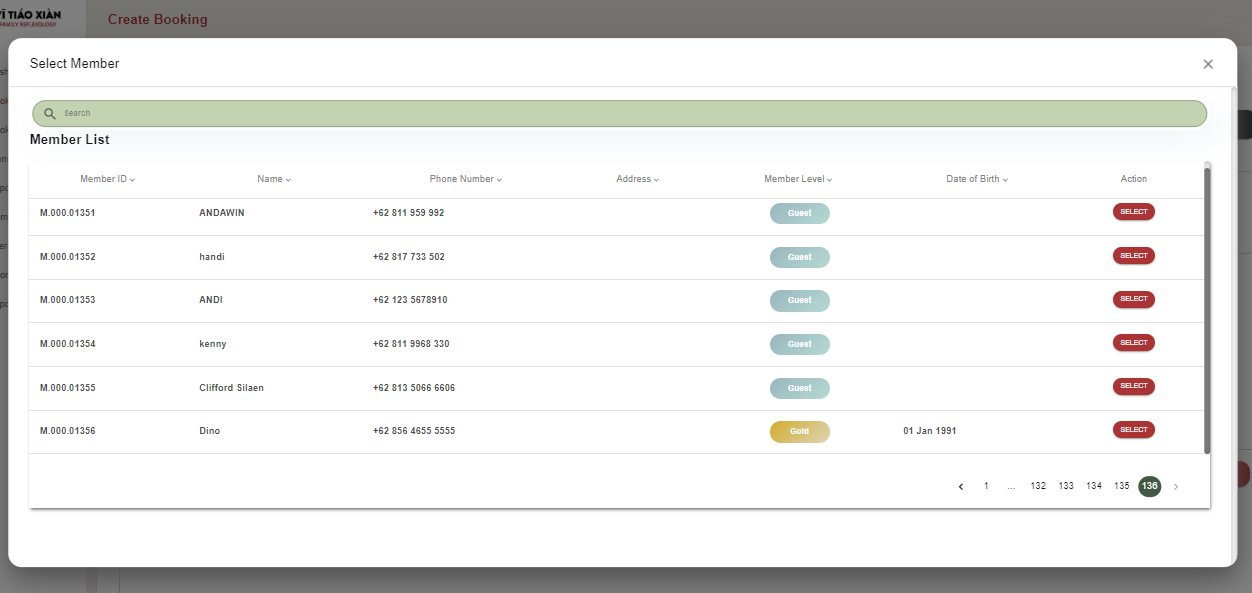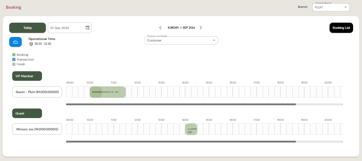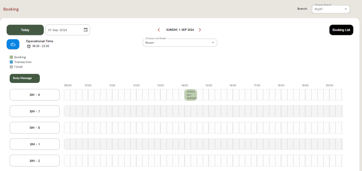 - Tombol Booking List di sebelah kanan atas memungkinkan pengguna untuk melihat daftar semua booking yang telah dibuat.