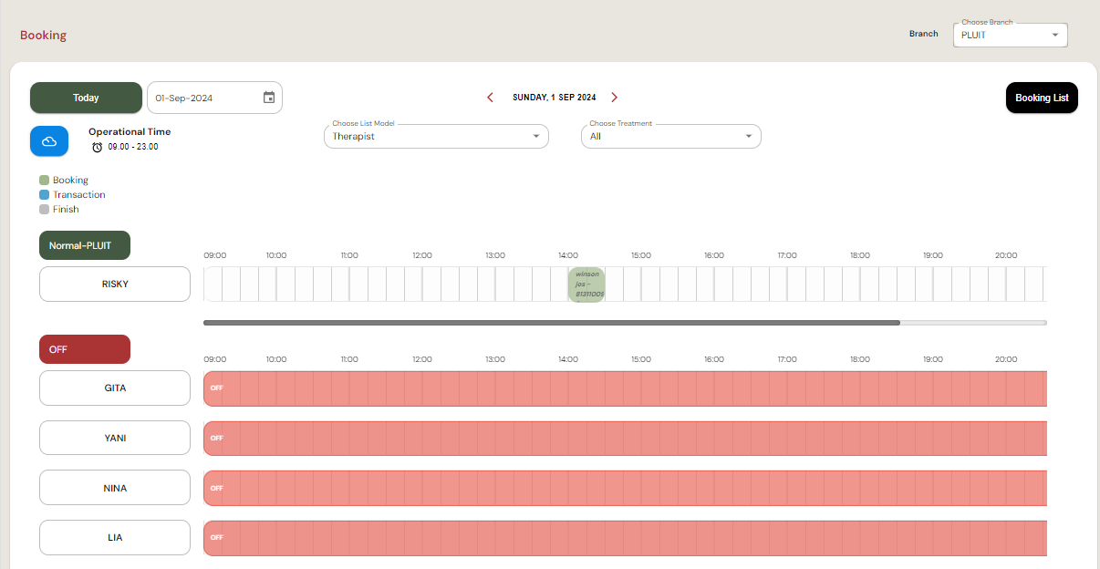 - OFF: Terapis yang sedang tidak bertugas (ditandai dengan warna merah dan label "OFF").