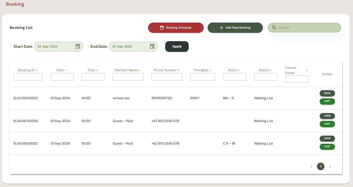 Gambar ini menampilkan daftar booking dengan detail seperti Booking ID, Tanggal, Waktu, Nama Anggota, Nomor Telepon, Terapis, Ruangan, dan, Status. Pengguna dapat memfilter booking berdasarkan tanggal, melihat atau mengedit detail booking dengan tombol VIEW dan EDIT, serta menambah booking baru dengan tombol Add New Booking.