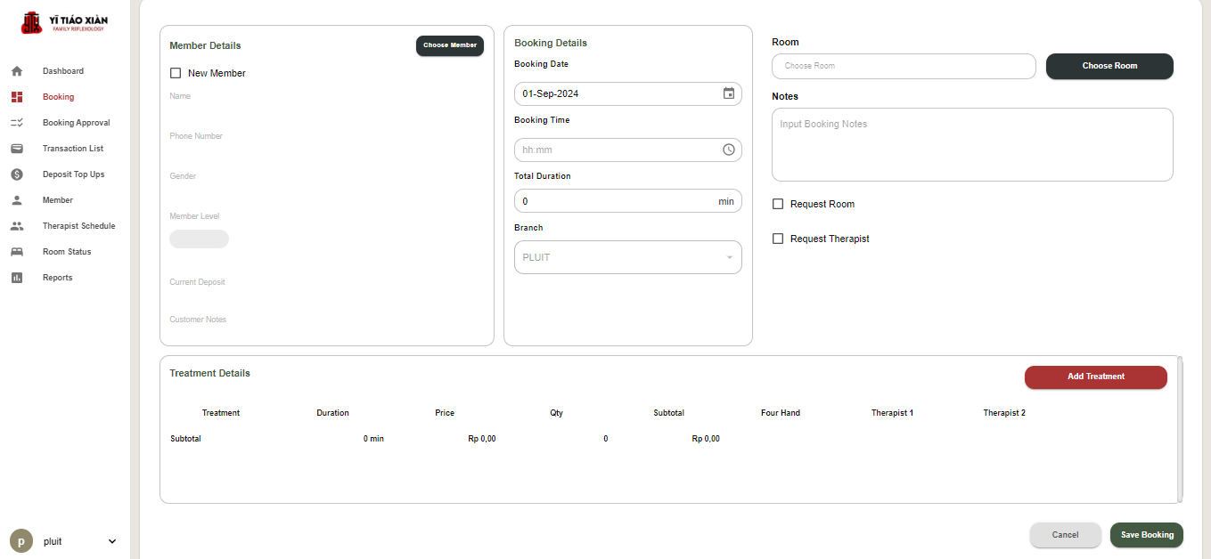 - Di bagian atas, pengguna bisa memilih tanggal booking menggunakan kalender dan memilih Branch (Cabang) dari dropdown. Saat ini, cabang yang dipilih adalah "PLUIT."