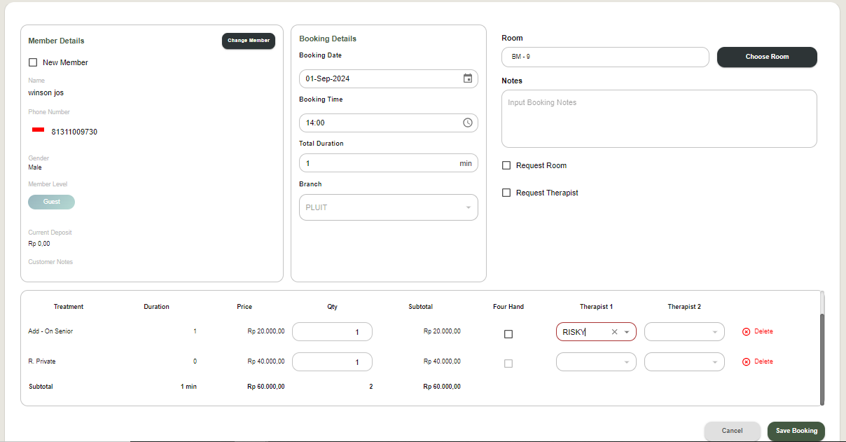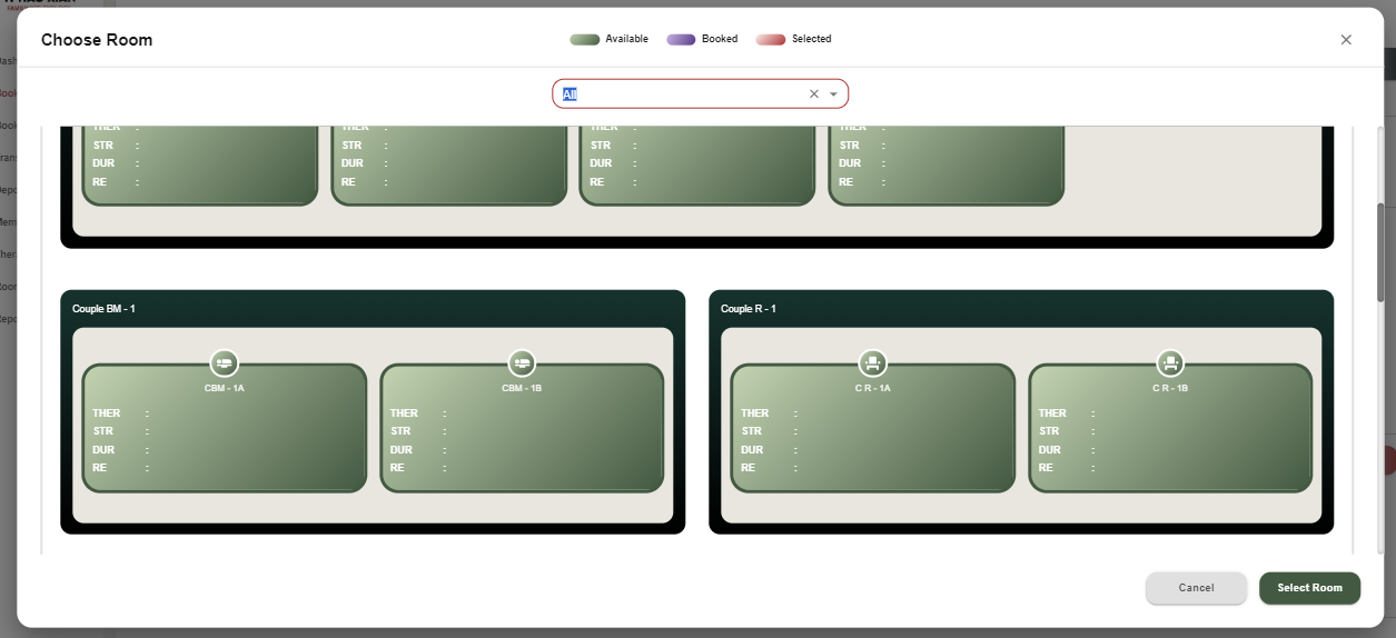 - Pengguna dapat mengklik slot waktu kosong pada terapis yang tersedia untuk membuat booking baru.