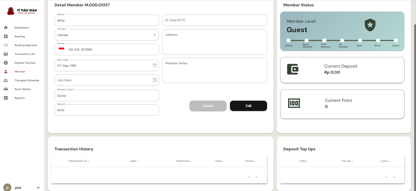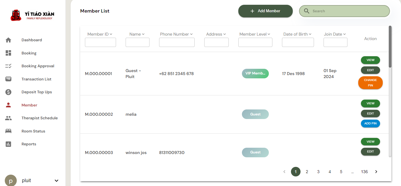 Halaman Member List digunakan untuk mengelola data anggota di sistem Yi Tiao Xian Family Reflexology.