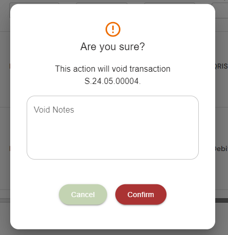 Pengguna harus memasukkan alasan pembatalan transaksi di kolom Void Notes sebelum melanjutkan. Catatan ini membantu mendokumentasikan alasan pembatalan untuk referensi di masa mendatang.